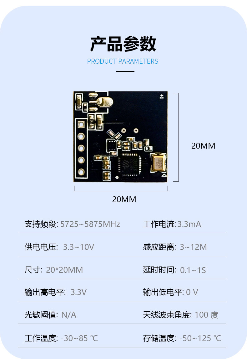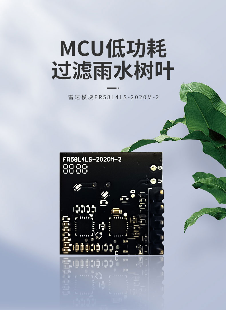 FR58L4LS-2020M-2 簡稱 2020M 是飛睿智能推出的高性能低功耗 5.8G 雷達傳感器,雷達模塊利用多普勒原理,通過天線發(fā)射高頻電磁波并接收初期反射波,以此判斷覆蓋范圍內(nèi)物體的移動,給出相應(yīng)電信號。模塊尺寸 20*20MM,該模塊集成了 5.8G 微波電路、中頻放大電路以及信號處理器,集成度高且生產(chǎn)一致性好,模塊內(nèi)置32 位 MCU 和收發(fā)天線,大大提高了傳感器的感應(yīng)性能。雷達模塊感應(yīng)距離遠、角度廣、無死區(qū)、透鏡和透鏡老化問題不受溫度、濕度、氣流、灰塵、噪聲、亮暗等影響。模塊內(nèi)植入濾雨樹葉算法,能過濾掉雨水樹葉的誤觸發(fā),性能穩(wěn)定,廣泛應(yīng)用于智慧照明、智慧安防等多個領(lǐng)域。